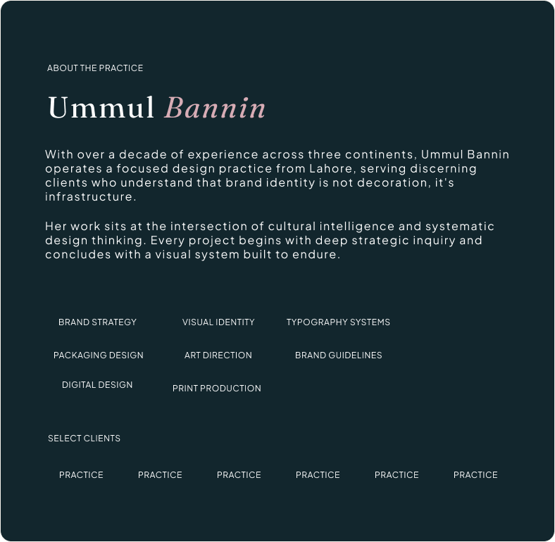 Your audience, competitors, and positioning defined before anything is drawn. Every visual decision anchored in brand strategy, not personal taste. This is where most designers skip. it is where I start.